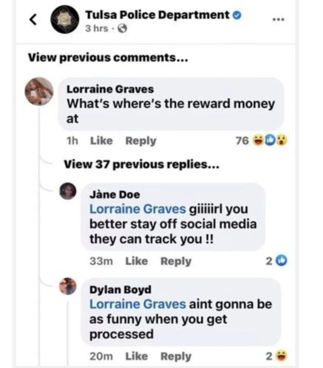 La sospechosa comentó el post preguntando por el dinero de la recompensa. “¿Dónde está el dinero de la recompensa?”, bromeó. Gracias al comentario y a las acciones de la Policía, esta mujer, Graves, fue localizada y arrestada por el cargo de cómplice de asesinato tan solo unas horas después de conectarse al “Face”.