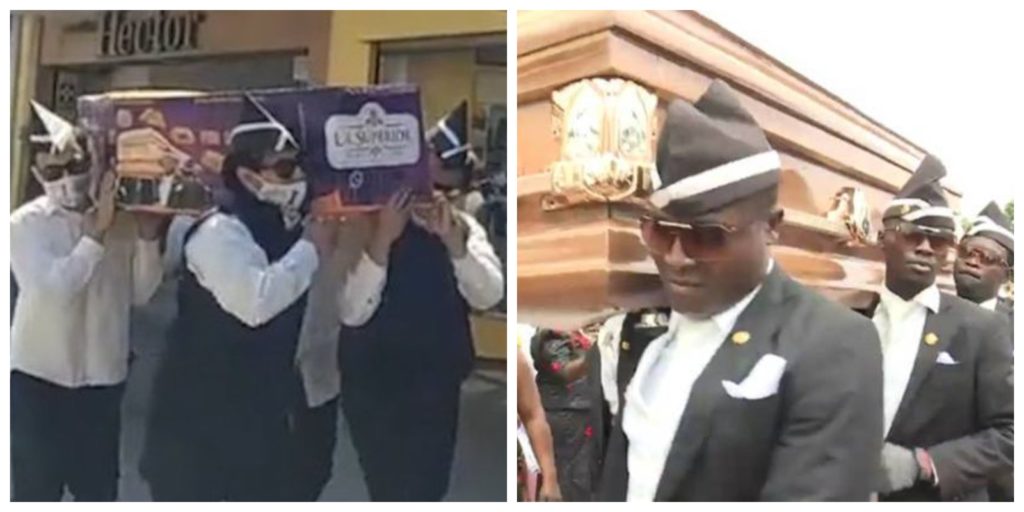 A través de diversas imágenes que circulan por internet, se ve a un grupo de hombres cargar una caja de cartón en los hombros como lo hacen los bailarines de cortijos fúnebres de Ghana, para promocionar su pan de muerto.