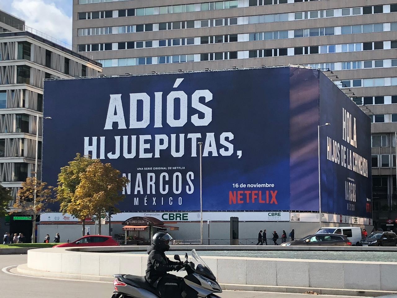 La publicidad, colocada en una enorme lona en dos caras de un edificio en Madrid dice en una cara el texto “Adiós, hijueputas,” mientras que en la siguiente dice “Hola, hijos de la chingada”.