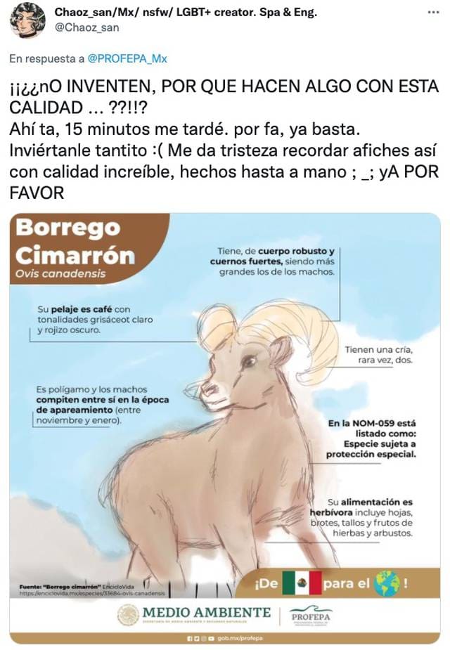 Y es que no gustó en redes sociales la ilustración que hizo la Profepa del borrego cimarrón por lo que inmediatamente las críticas a la dependencia no se hicieron esperar.