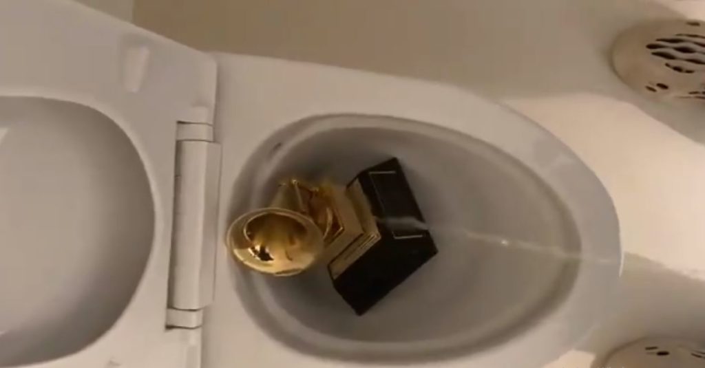 Kanye West puso de nuevo al mundo a hablar de él: meter al retrete uno de sus 21 Grammy y orinarlo, como protesta y declaración de guerra en contra de las compañías disqueras y la Academia de la Grabación, pues considera que los contratos a los artistas los priva de tener libertad sobre su obra y los esclaviza.