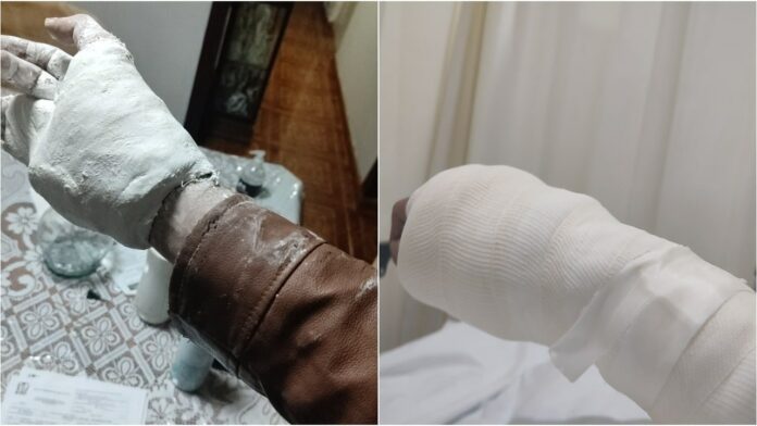 Asimismo adjunto una foto en la que se puede ver el yeso de gran tamaño en su mano, lo cual imposibilitaría quitarse la prenda.