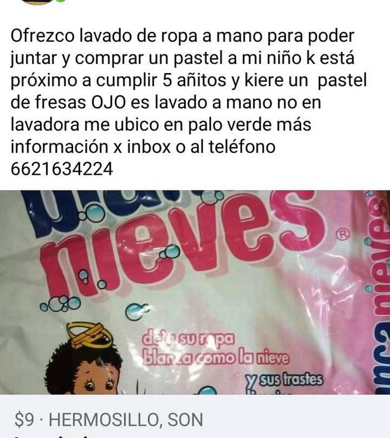 La publicación fue realizada en un grupo de facebook, en ella, una madre de Hermosillo, Sonora ofreció lavar ropa ajena para de juntar dinero para comprarle un pastelito a su hijo por su cumpleaños.