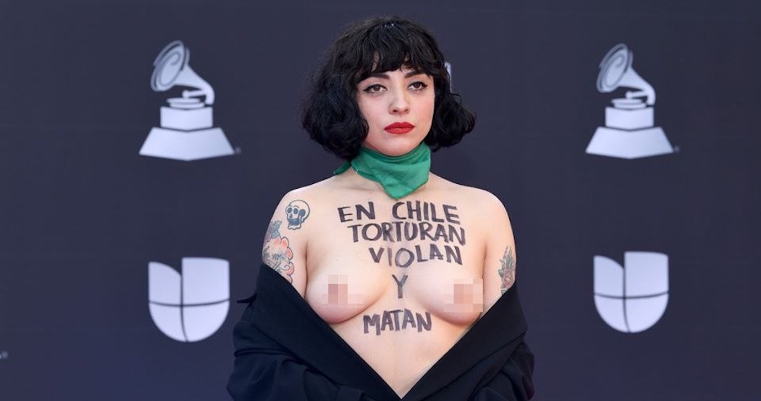 La cantante chilena Mon Laferte sorprendió a los medios de comunicación cuando mostró los senos en la alfombra roja de los Latin Grammy en señal de protesta por la situación de violencia que vive su país.