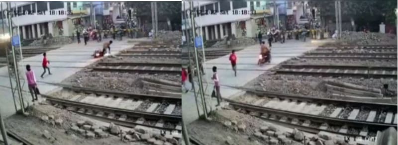 En un vídeo de una cámara de vigilancia, grabado el pasado 12 de febrero, se observa cuando varias personas están caminando por este paso a nivel de Auraiya (Uttar Pradesh, India) cuando, de repente, un motorista se cae en medio.