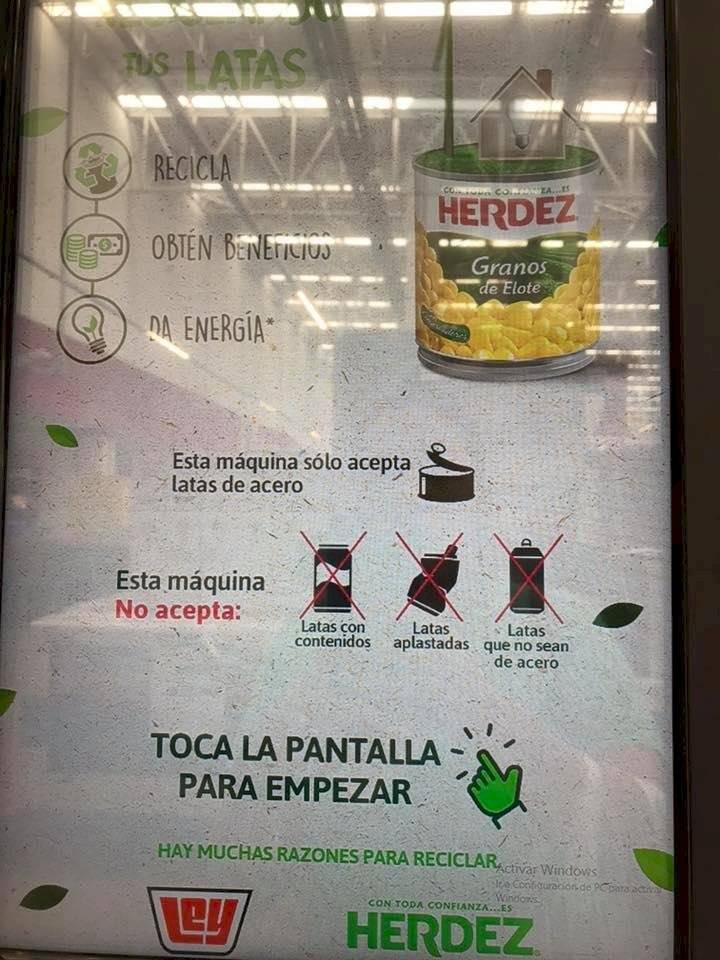 Estás máquinas aceptan como pago latas de acero, por lo que las latas de refresco no sirven; las que sí, son las latas de frijoles, verduras, chiles y similares.