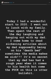 “Hoy tuve un maravilloso comienzo de 2020. Salí a almorzar con mi familia y luego pasé el resto del día riendo y pasando el rato con mi papá. Vengo a casa a leer nauseabundos artículos sobre mi papá supuestamente en su ‘lecho de muerte’. ¡A veces los medios me enferman! No es un secreto que mi papá ha tenido un año difícil tratándose de su salud, pero al carajo esto es una mi*rda total”, sería la traducción del mensaje que Kelly puso en Instagram.