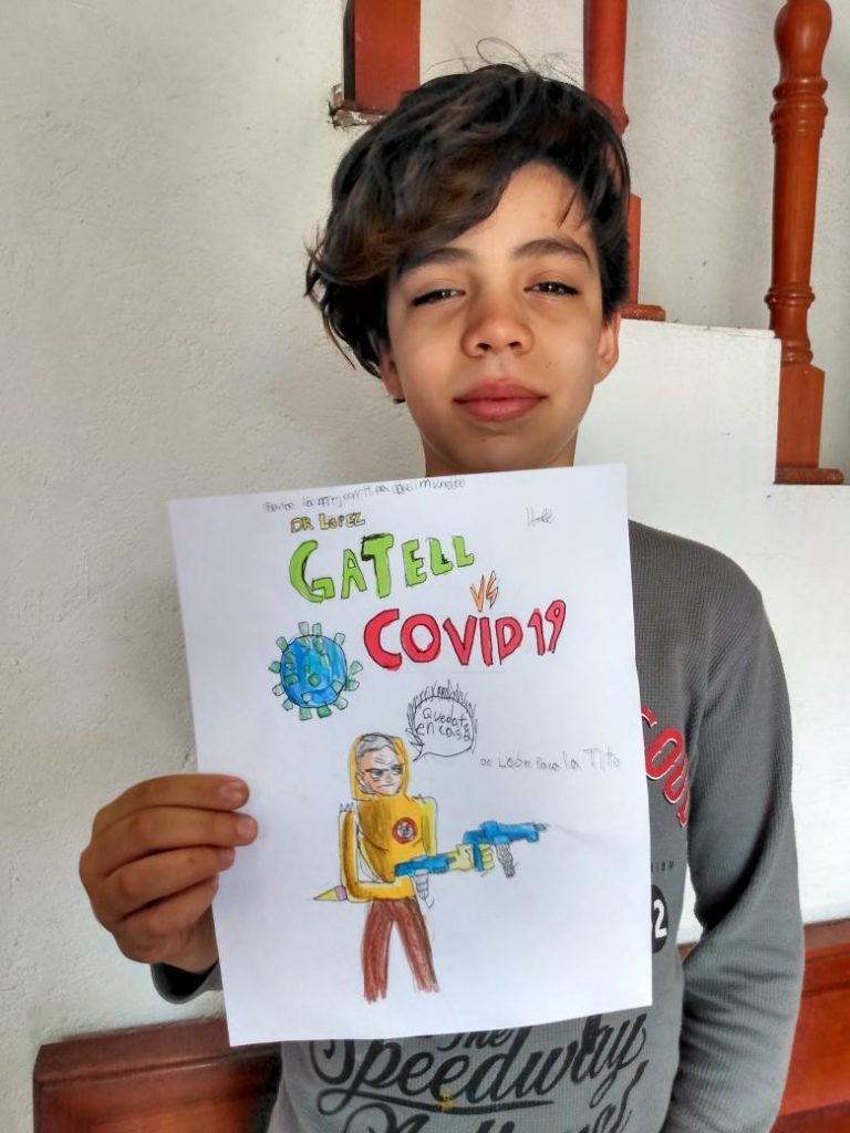 Para muestra está León Gutiérrez, un niño de nueve años de edad que dibujó al subsecretario de Salud como si fuera un superhéroe que con pistolas de gel en mano se dispone a acabar con el coronavirus.