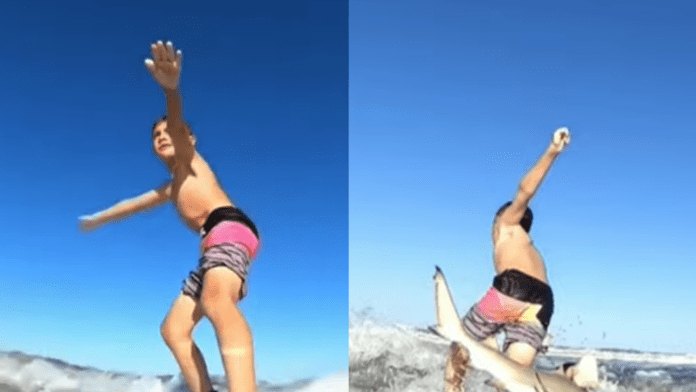 Una cámara logró captar el momento en que un niño fue golpeado por un tiburón mientras surfeaba junto a su padre y se ha hecho viral.
