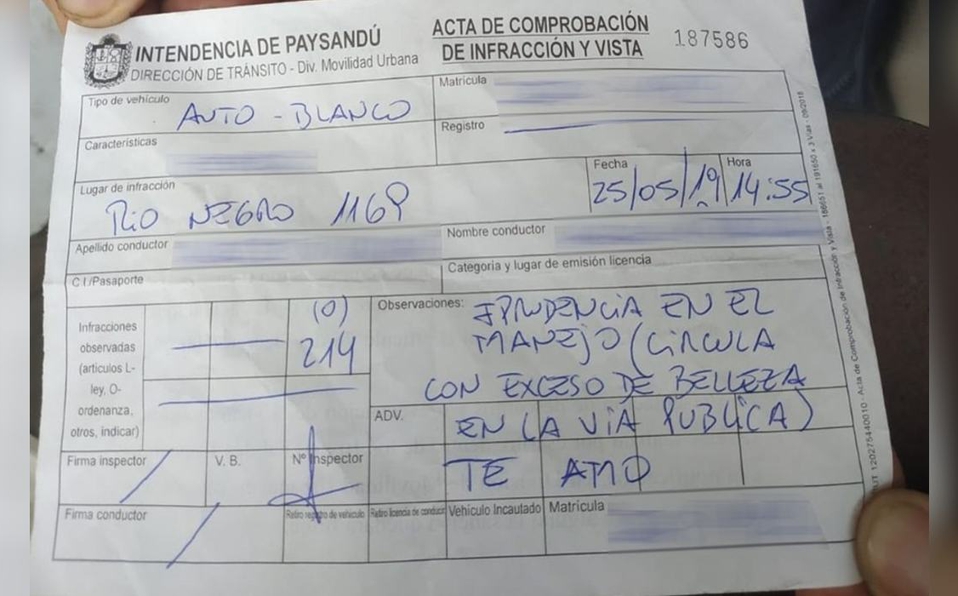 Una mujer que prefirió guardar el anonimato denunció ante un periódico local de Uruguay el acoso que sufrió por parte de un oficial de tránsito, pues al llegar a su auto encontró una infracción en su parabrisas en la que la multaban por circular a “exceso de belleza”.