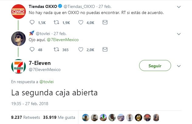 Posteriormente, un usuario de nombre @tovlei, mencionó a 7-Eleven, quien de manera lista respondió al tuit: “La segunda caja abierta”.