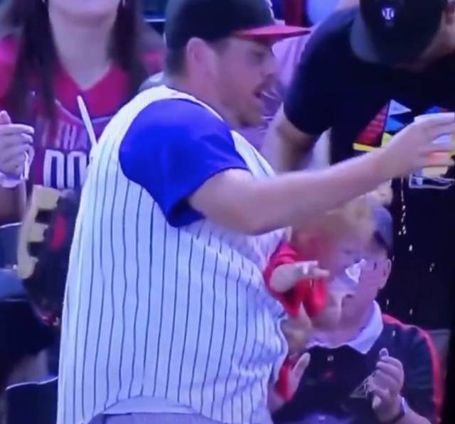 El hombre soltó a su bebé para atrapar la pelota de béisbol pero sin dejarla caer, mientras que sólo derramó apenas dos gotas de cerveza.