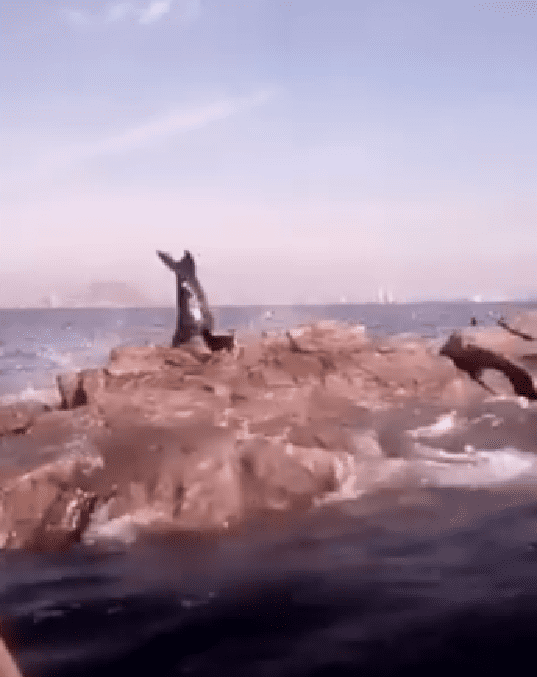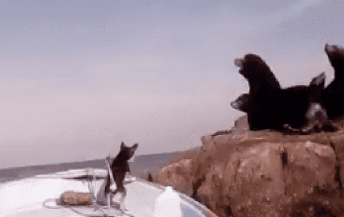 La emoción del cachorro se desbordó cuando pasaron por un bloque de piedra junto a un grupo de lobos marinos que se encontraban descansando hasta que vieron el bote y comenzaron a hacer ruido, es aquí en donde salió el defensor de los humanos para hacerle frente a estos enormes animales.