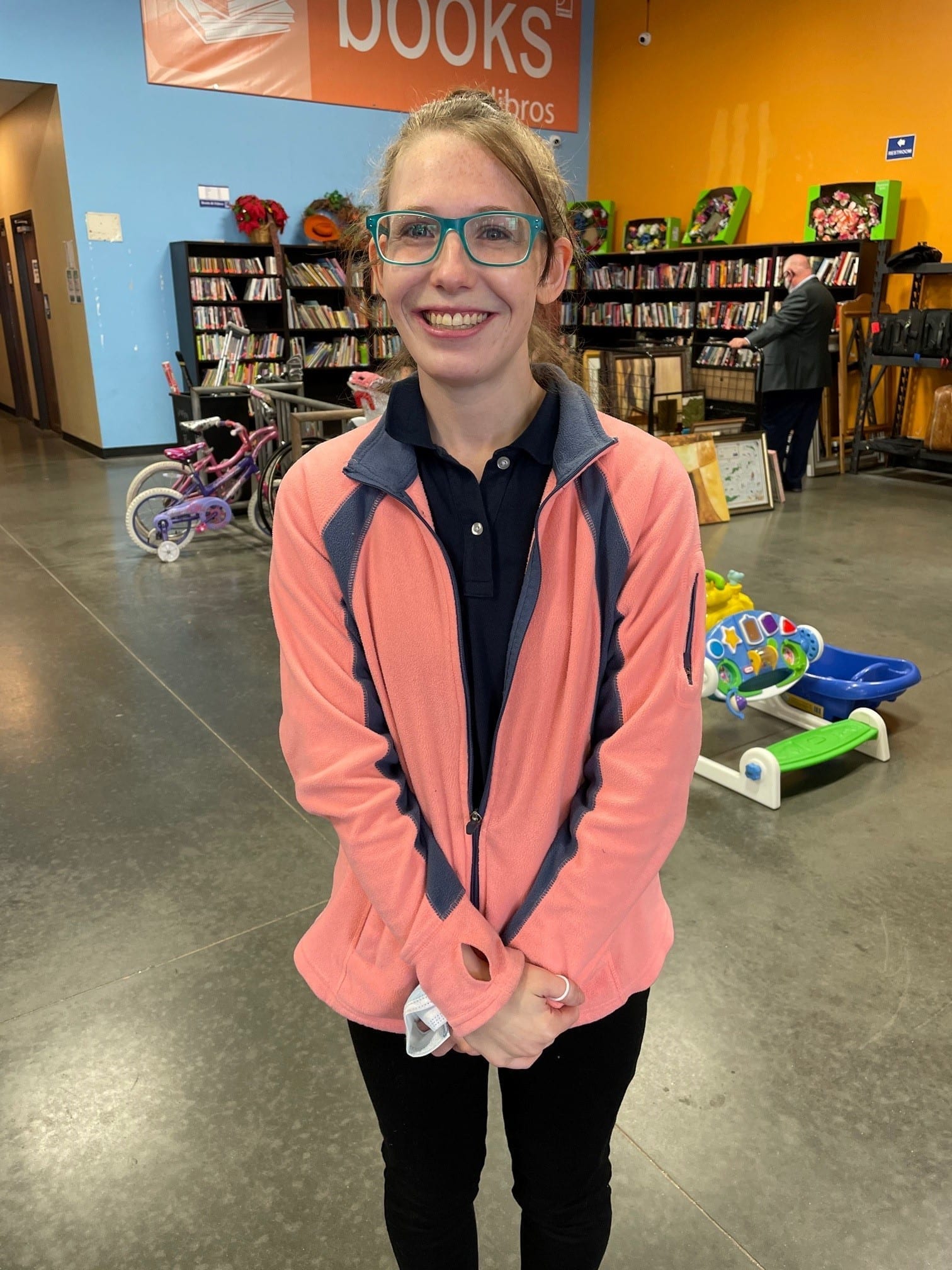 La chica se llama Andrea Lessing. A mediados de marzo el lugar donde labora recibió una donación. Este sitio se dedica a ayudar a personas con discapacidad y problemas económicos. Se llama Goodwill Industries.