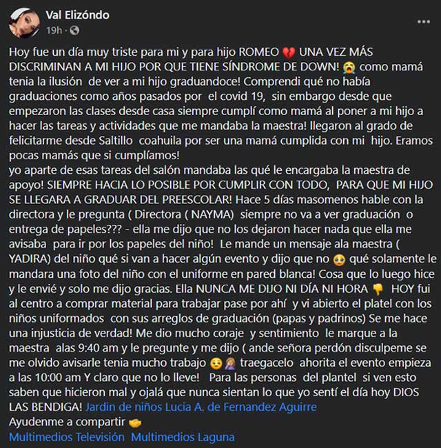 Val Elizondo hizo una publicación en la que expuso que su hijo Romeo fue discriminado por tener síndrome de Down. Según su testimonio, durante las clases a distancia por la pandemia de Covid-19, ella y su hijo era de los pocos que si cumplían con todos sus deberes y tareas.