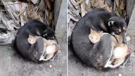 En las imágenes, publicadas por un usuario este jueves en Twitter, se ve que el gato y el perro intentan calentarse abrazándose.