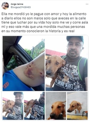 Jorge relata en sus historias de Twitter que el tiempo y el amor fueron clave para que la perrita le tomara confianza, la cual conoció un día en la calle y se le acercó en lo que esta lo ataca con temor y lo muerde fuertemente.