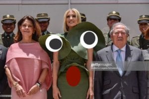 Ivanka lucía un vestido verde de 1.650 dólares, según indica The Independent. Mientras posaba para la foto junto a la vicepresidenta de Colombia, Marta Lucía Ramírez, y el Ministro de Defensa Nacional de Colombia, Guillermo Botero, el viento volteó las mangas de su vestido creando un efecto bastante peculiar.