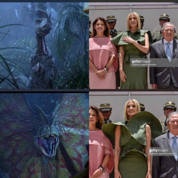 Ivanka lucía un vestido verde de 1.650 dólares, según indica The Independent. Mientras posaba para la foto junto a la vicepresidenta de Colombia, Marta Lucía Ramírez, y el Ministro de Defensa Nacional de Colombia, Guillermo Botero, el viento volteó las mangas de su vestido creando un efecto bastante peculiar.