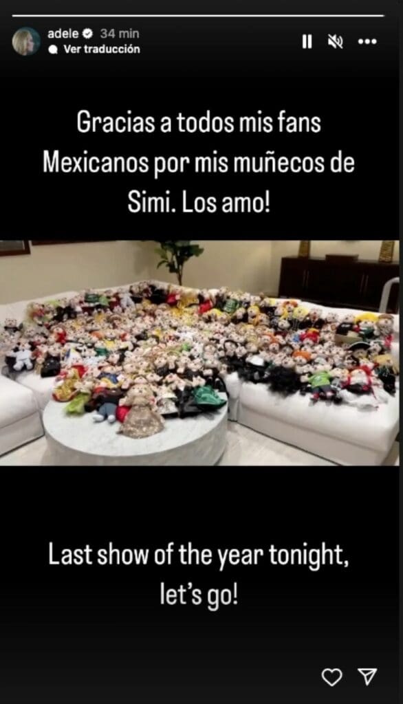 Adele acompañó el video con un texto en el que se leía: “Gracias a todos mis fans mexicanos por los muñecos de Simi. Los amo!”, mencionó la cantante en español, para después recordar que hoy da el último concierto de este 2023. “Last show of the year tonight, les’t go!” (Esta noche el último show del año ¡vamos!”, escribió para acompañar las imágenes en las que presumió la gran colección peluches de las Farmacias Similares.