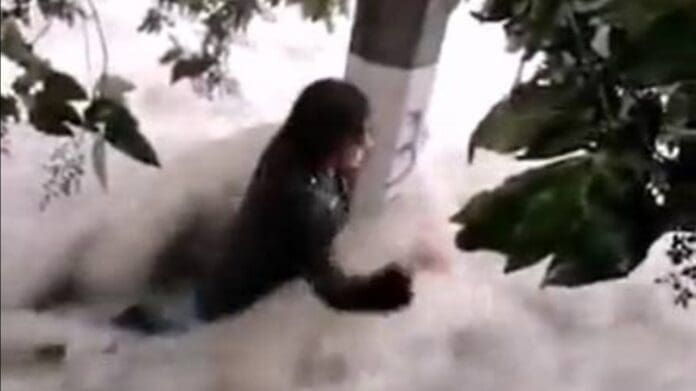 En el video que circula en redes sociales, se observa al joven abrazado al poste para evitar ser llevado por la corriente.