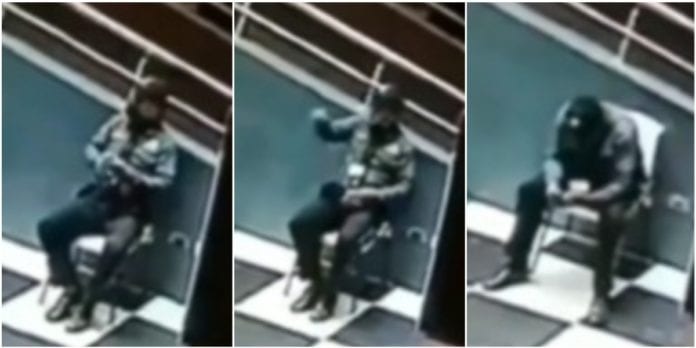 En la grabación se puede ver el momento en el que un guardia de seguridad se encuentra sentado en una silla y conversa supuestamente con otra persona e incluso la saluda en un par de ocasiones con el puño, pero a simple vista no se ve nada.