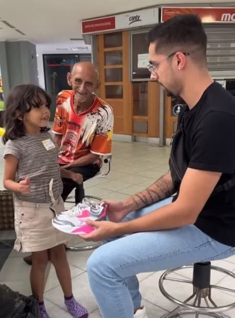 Además de invitarlos al cine, donde les compra palomitas y dulces, en el clip también se aprecia que el joven decide regalarles un par de tenis a cada uno.