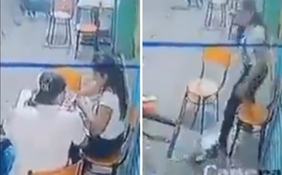 En el video se ve a la pareja sentada en una mesa, cuando de pronto el hombre golpeó en el rostro a la mujer provocando que se golpeara la cabeza contra la cortina metálica de un comercio.