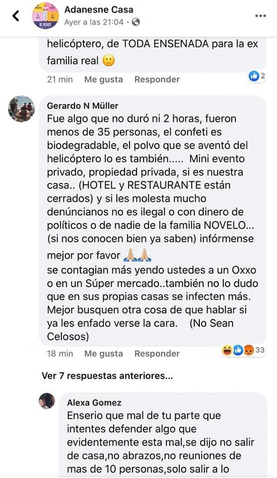 “Fue algo que no duró ni 2 horas, fueron menos de 35 personas, el confeti es biodegradable, el polvo que se aventó del helicóptero lo es también… Mini evento privado, propiedad privada, si es nuestra casa.. (HOTEL y RESTAURANTE están cerrados) y si les molesta mucho denúncianos no es ilegal o con dinero de políticos o de nadie de la familia NOVELO.
