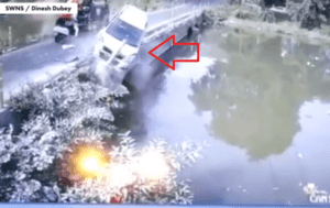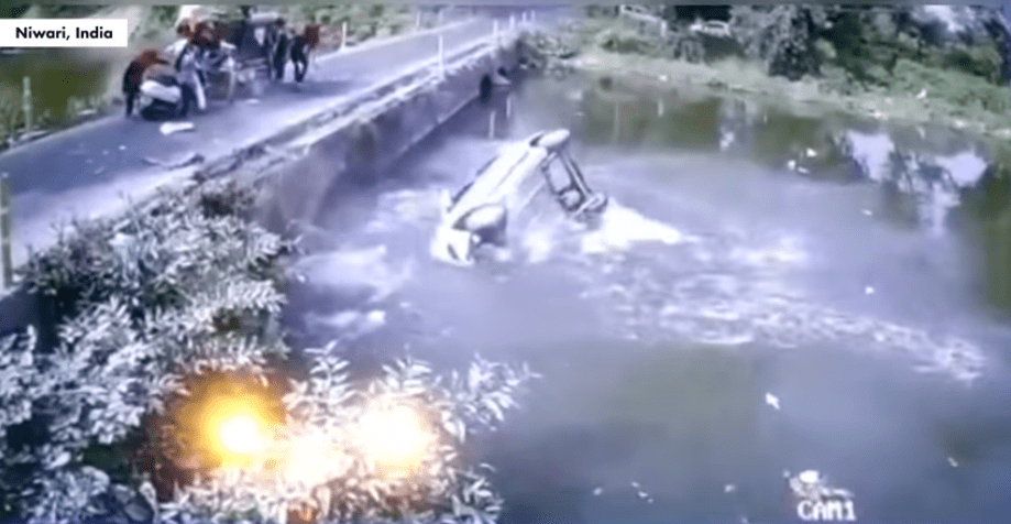 Las impactantes imágenes se registraron en Niwari, India y muestra el momento en que un vehículo se impacta con un camión y se voltea. La desesperación del hombre es tanta, que decide aventar a su hijo y por poco pierde la vida.