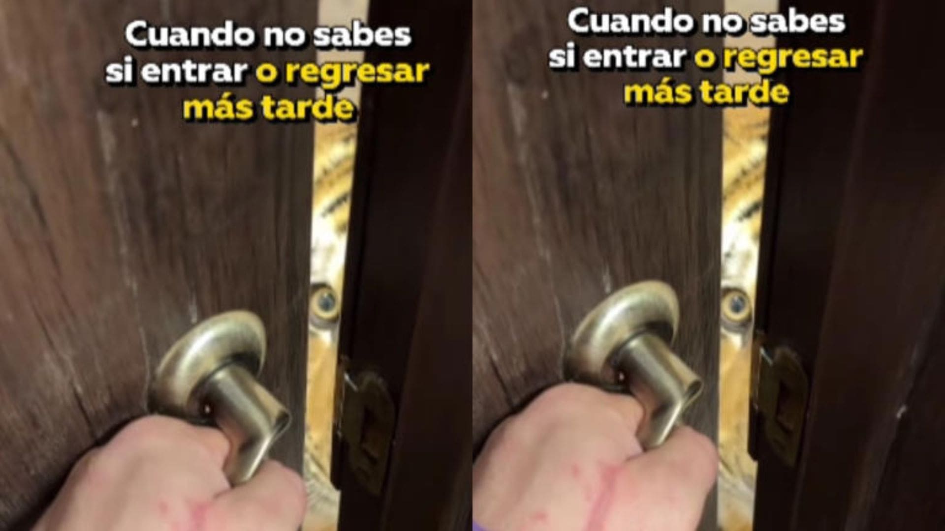 Las imágenes muestran el momento en que el dueño intenta abrir la puerta de su vivienda, pero se encuentra con el felino salvaje justo detrás de la entrada. La mirada del tigre, visible a través de la rendija, ha generado asombro y desconcierto entre los espectadores.