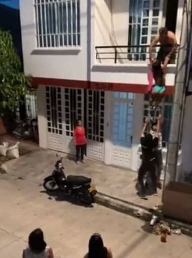 El video viral fue compartido en Twitter y muestra el momento exacto en que un grupo de personas ayudan a la amante de su vecino a escapar por el balcón de la casa.