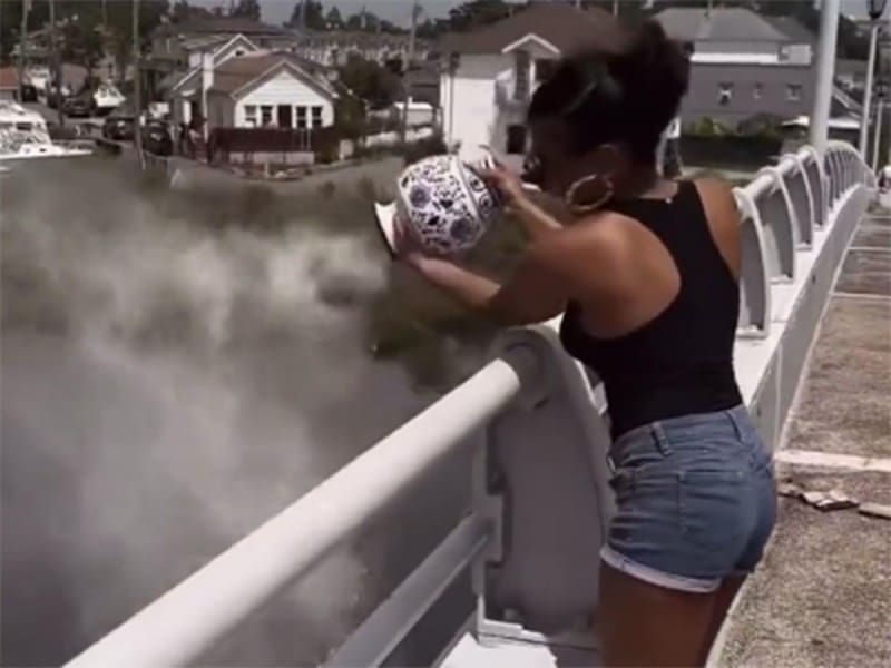 Esta mujer grabó el momento en que lanzó las cenizas de la mamá de su novio tras descubrir que le era infiel.