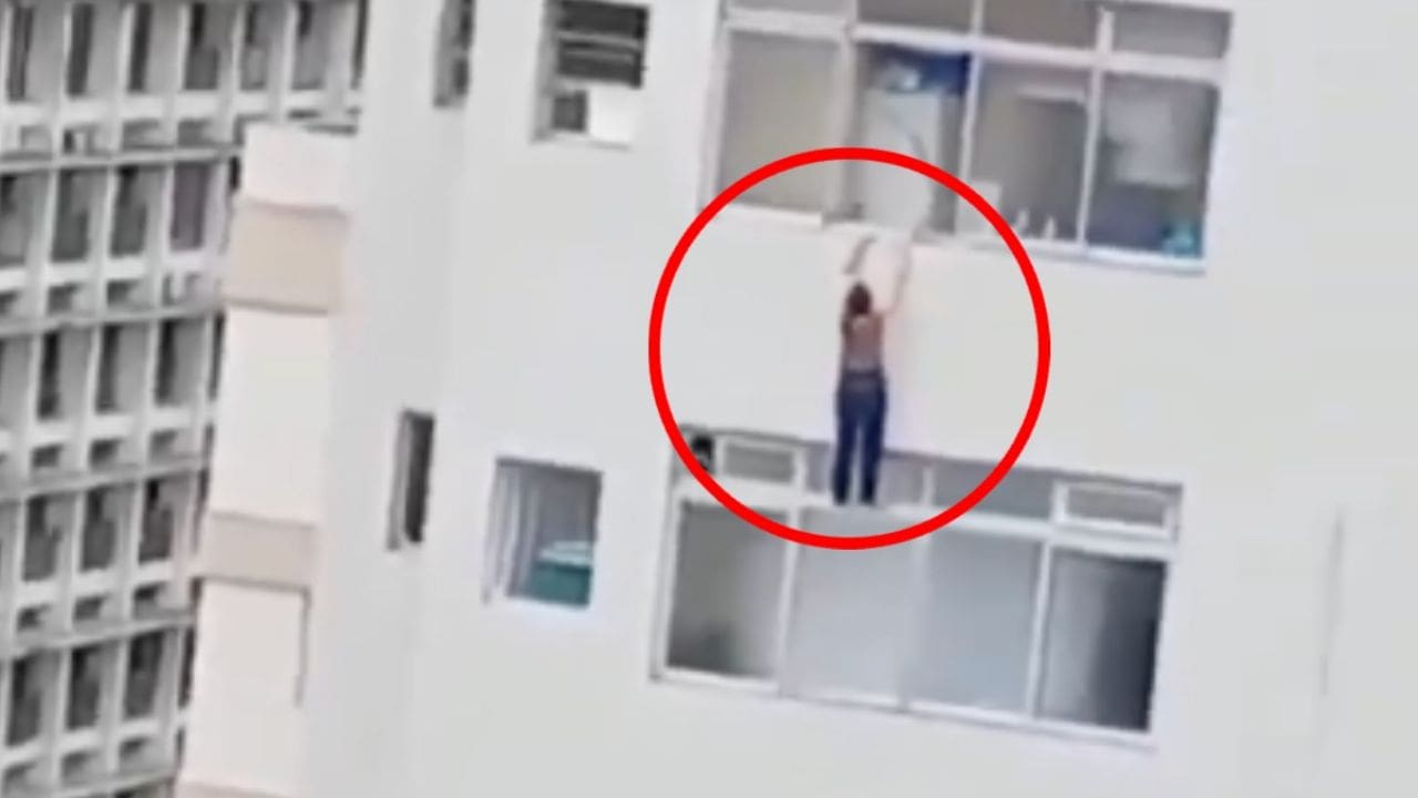 El video, compartido por la cuenta de X en Crónica Policial, muestra a la mujer, vestida con una blusa café y jeans azul marino, luchando por mantenerse agarrada del marco de la ventana mientras se escuchan gritos de ayuda. Algunos vecinos, alertados por la situación, subieron rápidamente para asistirla y evitar que cayera desde una altura de más de 60 metros.