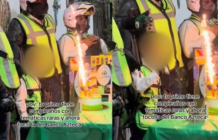 La descripción del video, que ya ha acumulado más de 3 millones de reproducciones en solo 24 horas, dice: “Pov: tu primo tiene cumpleaños con temáticas raras y ahora tocó la del Banco Azteca”.