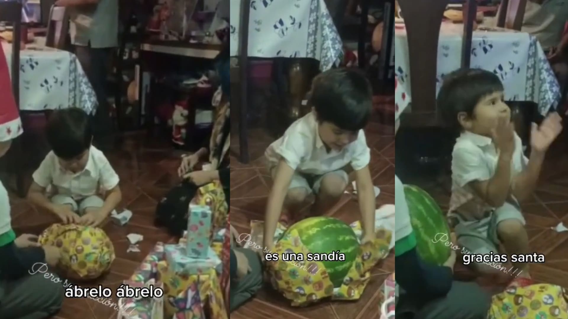 Así fue el caso de un niño que se hizo viral luego de que Santa le trajo una “sandía”, aunque para muchos fue un regalo particular, la emotiva reacción del niño al ver su fruta favorita fue lo que generó que cientos de internautas se enternecieron al ver cómo el pequeño con tan poco era feliz.