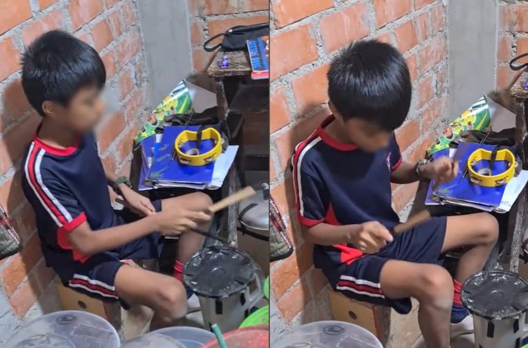El niño, cuyo nombre aún no se ha revelado, se sienta con confianza en un banco improvisado, sus manos hábilmente golpeando la batería casera al ritmo de la música. Su habilidad para mantener el ritmo con materiales tan simples ha impresionado a la comunidad en línea, generando una ola de apoyo y admiración.