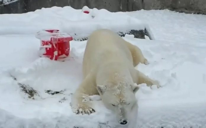 Uno de ellos, es Blizzard, un oso polar de 25 años, de quien Cindy, su cuidadora, posteó: “¡Está teniendo el mejor día de nieve del mundo!”.