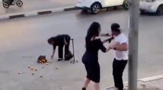 Durante la pelea de la pareja, la señora tira sus naranjas en medio de la carretera