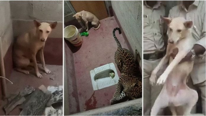 El perro y el leopardo quedaron atrapados por varias horas dentro de un baño, luego de que el felino persiguiera al can en una calle de la India.