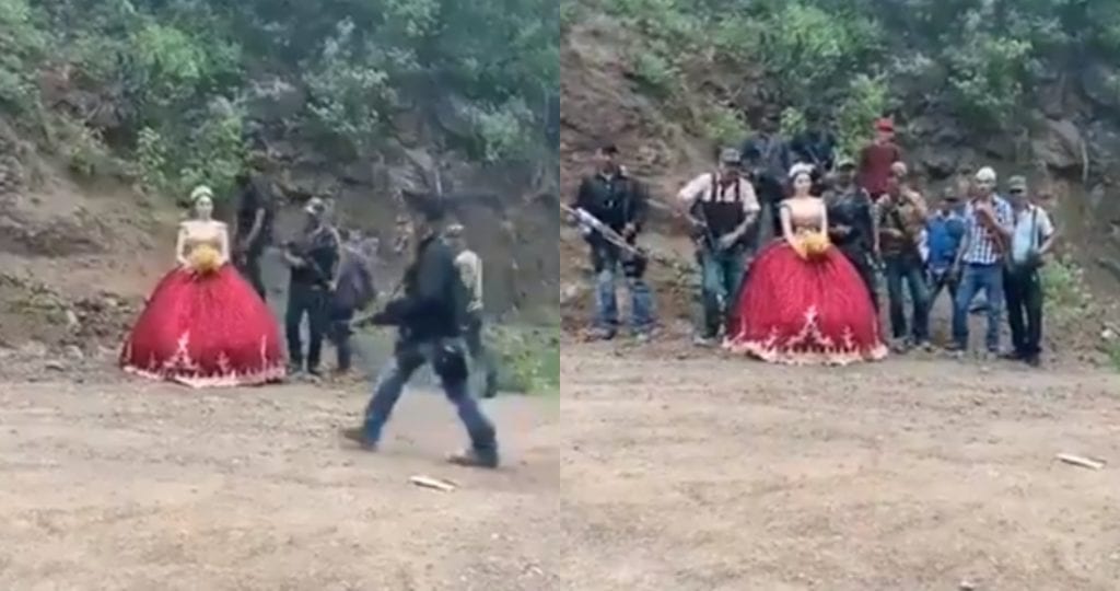 En las imágenes se aprecia a la quinceañera con un vestido en color rojo, rodeada de varios hombres vestidos con camisas de cuadros y jeans, todos con armas de fuego, algunas personas aseguran que son sicarios.