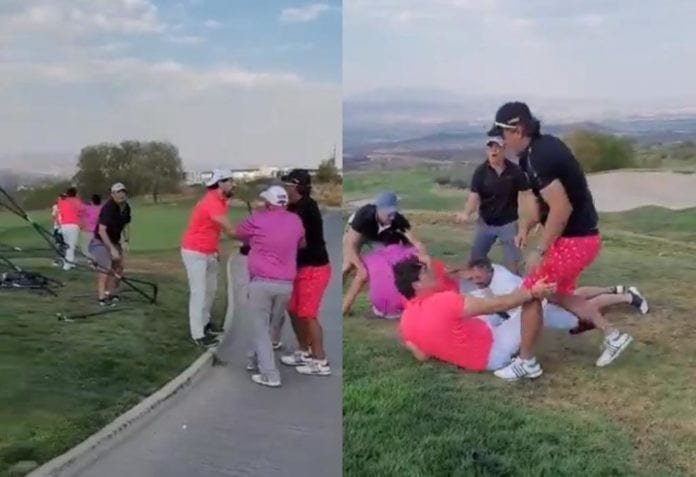 A través de un video, que se ha viralizado, se observa cómo el grupo de hombres, vestidos con ropa ideal para jugar golf: pantalones color claro y bermudas, se golpean y patean sin, afortunadamente, usar los palos o pelotas que se utilizan para este deporte.