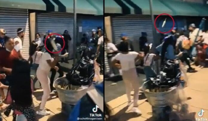 En una pelea entre policías y comerciantes, uno de ellos lanzó un elote con todo y palito a un uniformado. Todo quedó grabado en video y se volvió viral.
