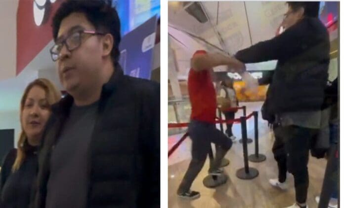 El intercambio de palabras escaló rápidamente, con el hombre profiriendo insultos y empujando violentamente al trabajador. La confrontación, que tuvo lugar cerca de un barandal de cristal en un tercer piso del centro comercial, generó preocupación entre los presentes ante el riesgo de un accidente grave.
