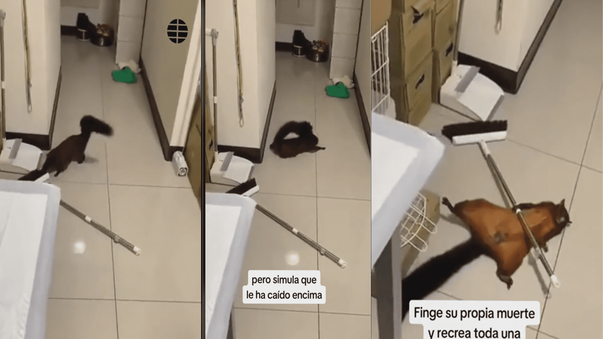 Y es que la pequeña ardilla no solo fingió su muerte al tirarse al suelo, sino que lo hizo de una forma inesperada, pues se colocó debajo del palo de escoba para engañar al humano de que había sido golpeada.
