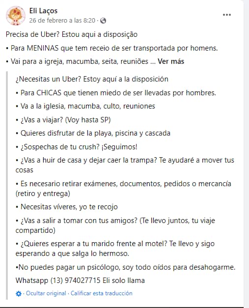 ¿Necesitas un Uber? Estoy aquí a tu disposición“, inicia en su listado; “Para CHICAS que tienen miedo de ser llevadas por hombres“, recalca. Según medios locales Cândido habría visto una publicación similar en redes sociales en apoyo de mujeres, por lo que decidió sumar su granito de arena, pero con un peculiar valor agregado.