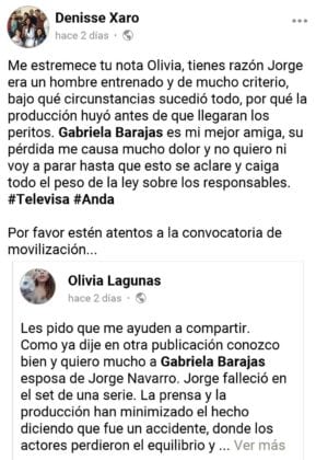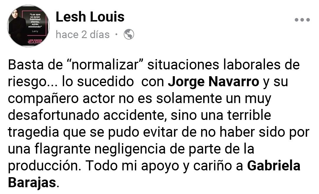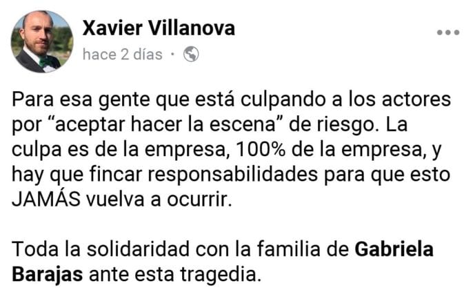 “A toda la comunidad les informo que me retiro del medio artístico pues mi proceso en la ciudad de México llegó a su fin. Yo ahora, no puedo exponerme por ningún error a trabajar en las condiciones en las que a veces estamos expuestos los actores en México. Este jueves le tocó a mi marido y a su compañero, ¿Mañana a quién? Es por eso que les agradezco de corazón sus condolencias y su amor incondicional por siempre! Ahora me dedicaré enteramente a mi hijo! A cumplir los sueños de su padre y mios que eran los mismos! Pero ahora sin mi gran compañero de vida en nuestra amada provincia.Tal vez mas adelante vuelva a los escenarios de teatro en Guadalajara para sanar mi dolor”, complementó.