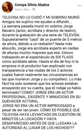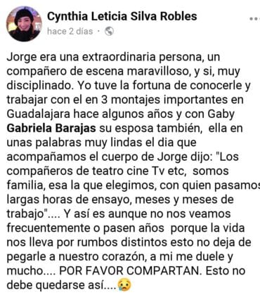 “Amadas familias, amigos del medio artístico, Actores, directores, dramaturgos, músicos, cantantes, gente de producción, mamitas del kínder y primaria de Jorgito, vecinos, gente maravillosa de todos los ámbitos que nos rodeaban en el día a día. A todos aquellos que nos conocieron, trabajamos y brindaron su amistad. Todos consternados por esta trágica, lamentable e irreparable perdida que atormenta todo mi ser. ¿Que como estoy? Con el alma y cuerpo destrozados… Rota! Furia, impotencia, rabia, coraje, tristeza, sueños interrumpidos! Una perdida con preguntas sin respuestas! Mis años maravillosos se fueron con el, pero sé que tengo que empezar a reconstruirme para no enfermarme pues hoy por hoy seré madre y padre!”, dice en un publiación en su perfil de Facebook.