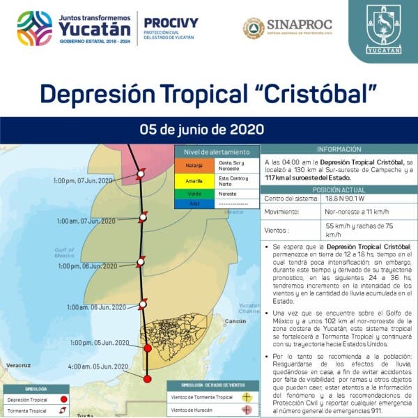 La Tormenta Tropical “Cristóbal” se localiza en tierra a unos 117 km al suroeste de Yucatán, a una velocidad de desplazamiento hacia el nor-noreste de 11 km/h; sus vientos máximos sostenidos alcanzan los 55 Km/h y con rachas de hasta 75 Km/h.