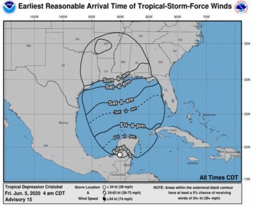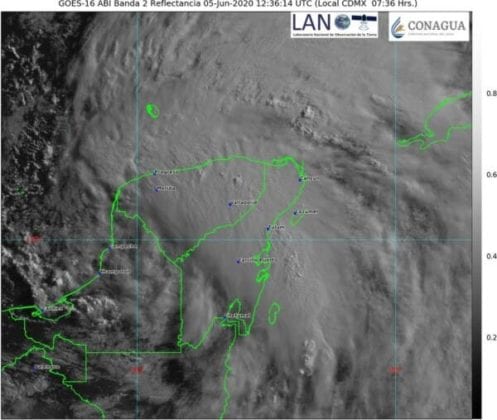 Este viernes 5 de junio de 2020, la depresión tropical “Cristóbal” se desplaza hacia el nor-noreste a una velocidad de 11 km/h. con vientos máximos que alcanzan los 55km/h.